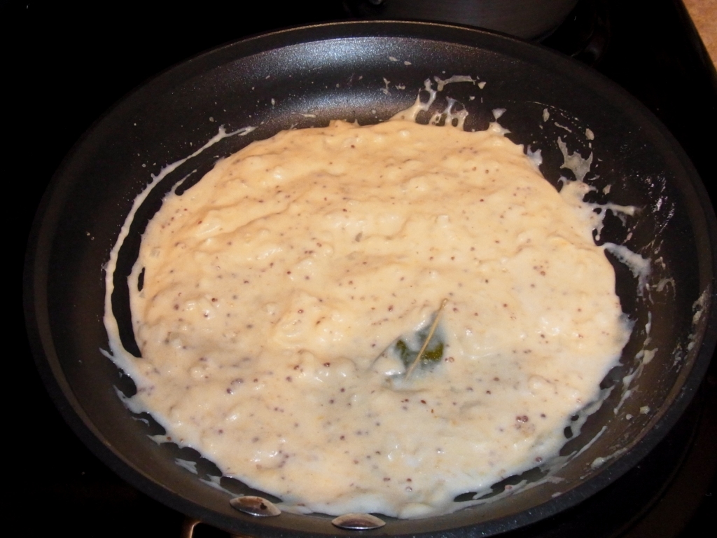④③に牛乳を少しずつ加えてダマにならないように混ぜ合わせ、玉ねぎ、ベイリーフ、粒マスタードを加え、とろみがつくまで10分程煮込む。(右の写真は、煮込んだ後)