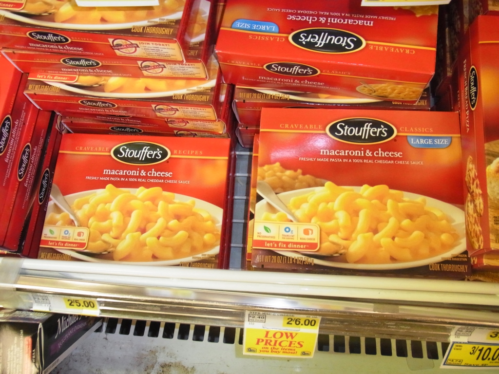 インスタント、冷凍もの、缶詰まで。マカロニチーズのコーナーがたくさんです。