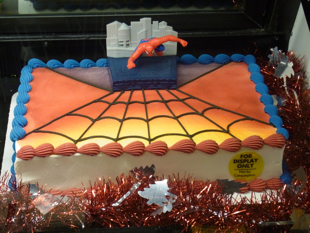 それから、表題とは全く関係ありませんが、先日、ようやく、アメリカっぽいケーキを見つけたので、ご紹介します。スパイダーマンケーキ!これが一番毒々しかったです。一応、これはディスプレイ用ですが、注文する人いるのかな・・・