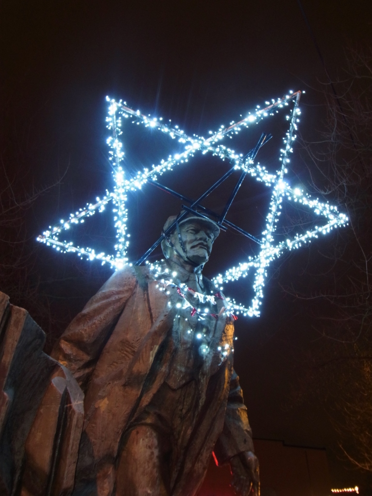 アーティストタウン、ヒッピータウンとも呼ばれるようですが、街中に不思議なアート作品があちこちに飾ってあります。左の写真はその一つのレーニン像。クリスマス仕様だったので思わず撮影。