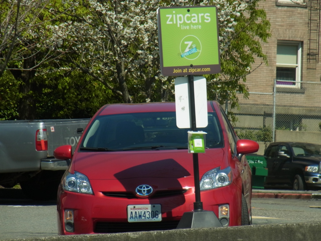 シアトルのダウンタウンを歩いていると、駐車場や道沿いに、Zipcarsという看板が立ててあり、車が駐車しているのを見ます。