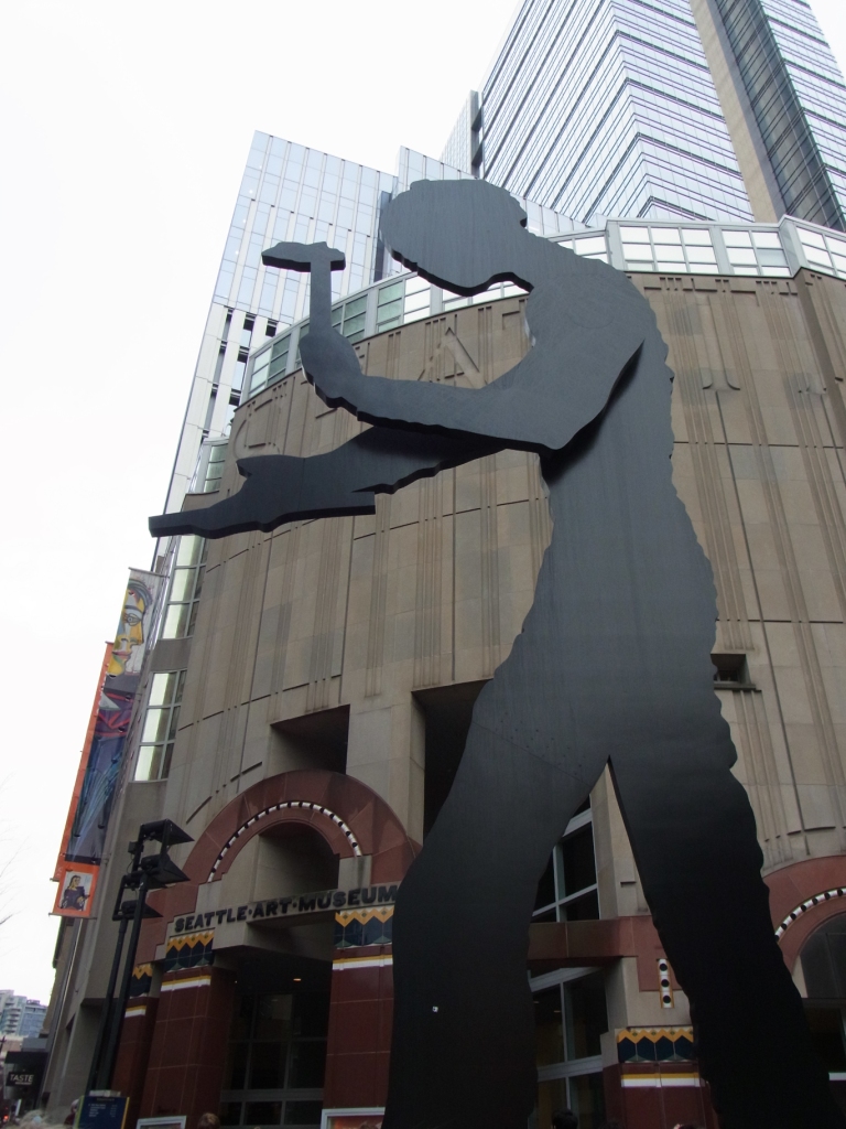 シアトル美術館(Seattle Art Museum、通称SAM)で17日まで開催されているピカソ展を見るためです。因みに、左の写真はHammering Manというシアトル美術館のシンボル彫刻です。ある意味ランドマークですね。ハンマーを持った手が上下に動きます。